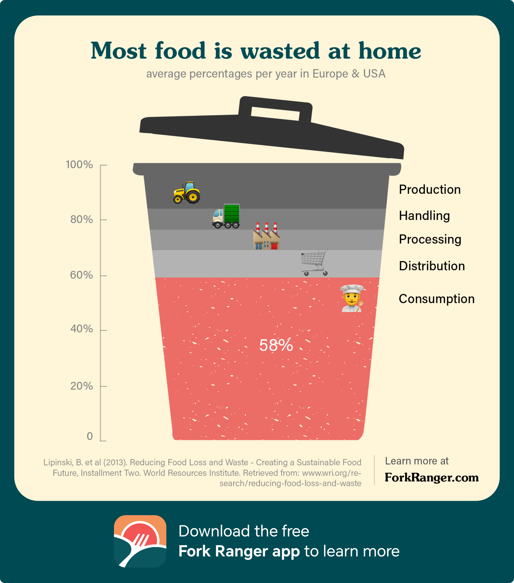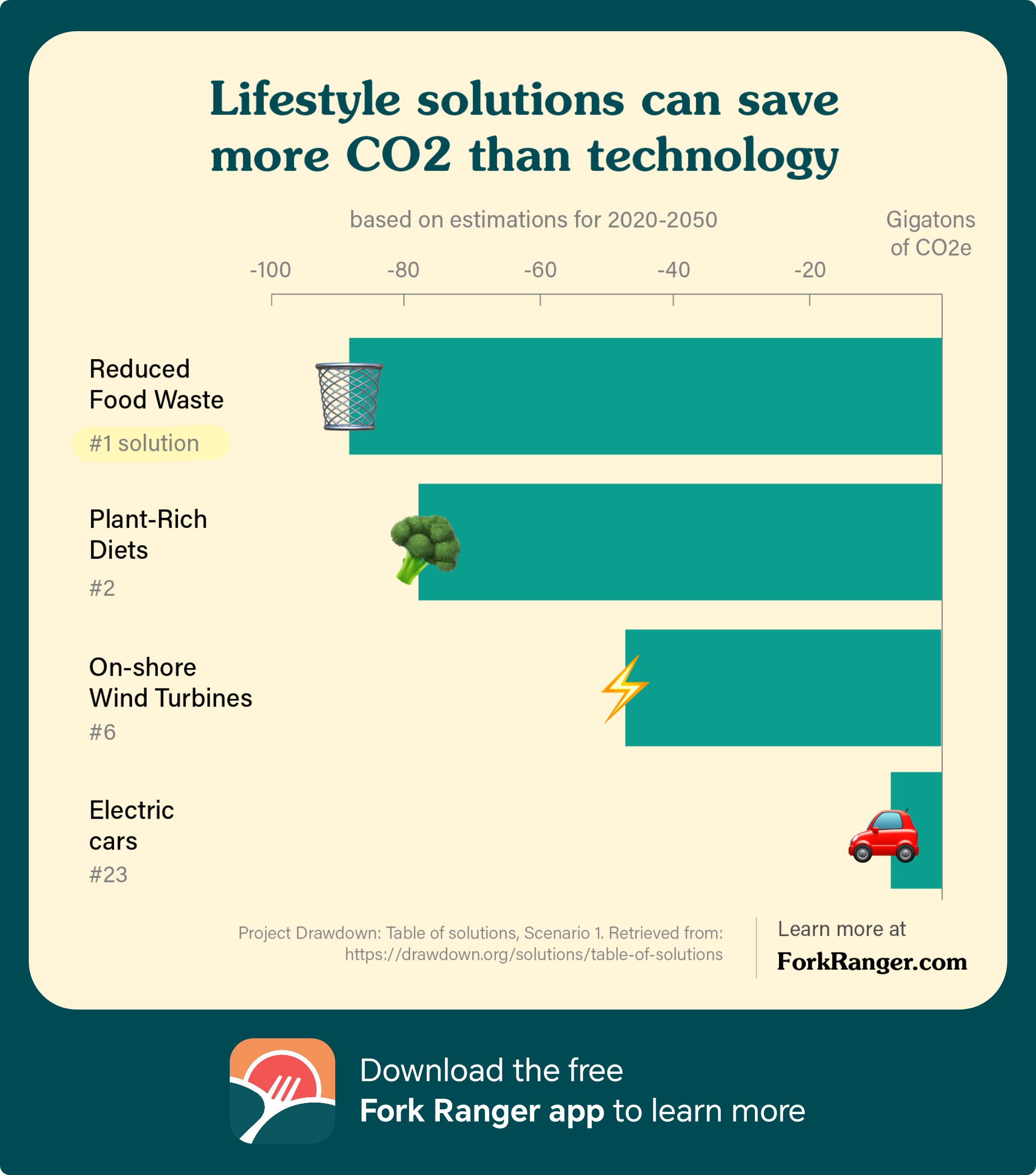Al adoptar hábitos de consumo más sostenibles, es posible disminuir este impacto y obtener ventajas tanto económicas como ambientales. Dado que la mayor parte de los residuos se genera en el hogar, una de las formas más efectivas en que una persona puede reducir sus emisiones de CO₂ es evitando el desperdicio de alimentos. A continuación, podrás ver unos gráficos realizados por Fork Ranger para que puedas tenerlo de manera más visual: