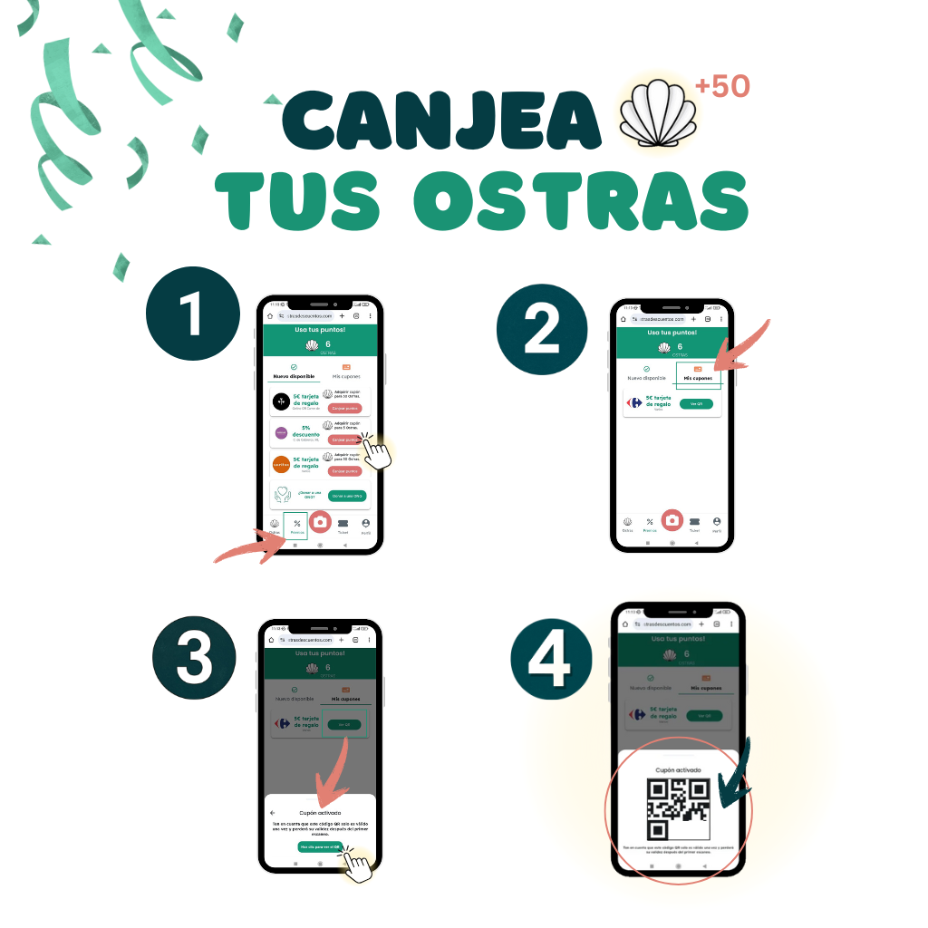 • Ahorra en tus compras: Si prefieres ahorrar, tus puntos también se pueden usar para conseguir tarjetas o cupones en tiendas como Carrefour o Veritas. Así aprovechas tus descuentos Ostras y reduces el costo de tus compras habituales.